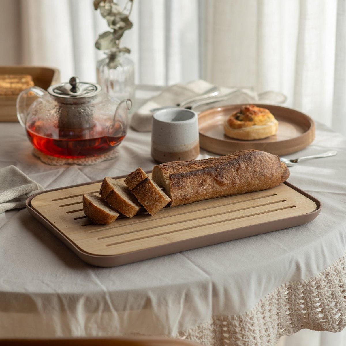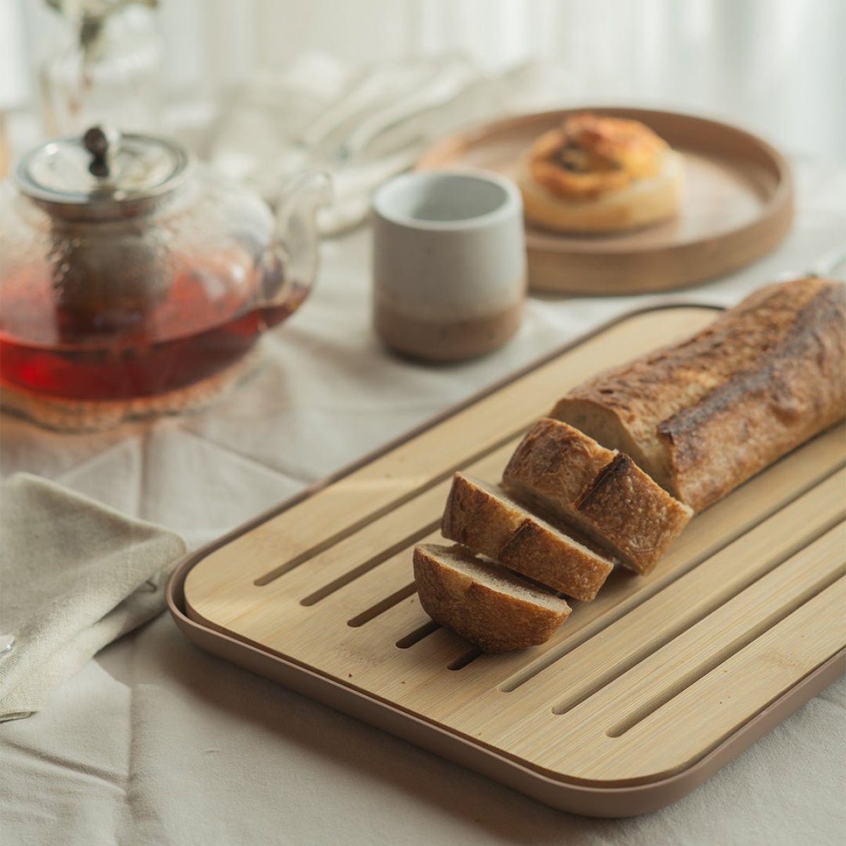 • Tábua de bambu com ranhuras e bandeja coletora de migalhas