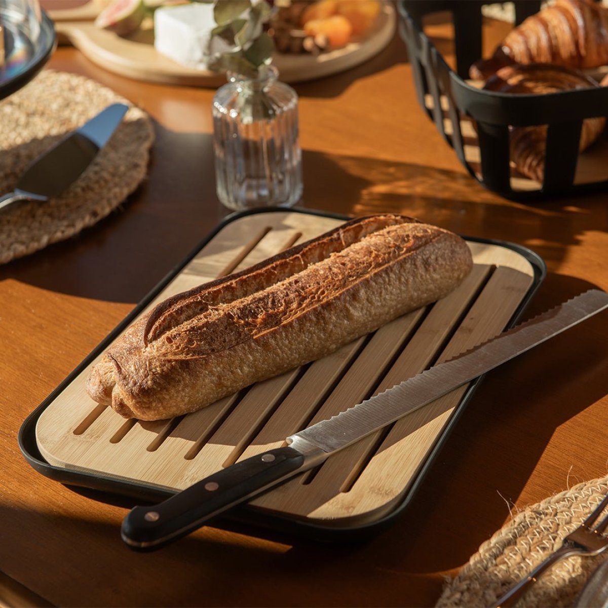 • Praticidade para cortar pães sem sujeira na mesa ou bancada