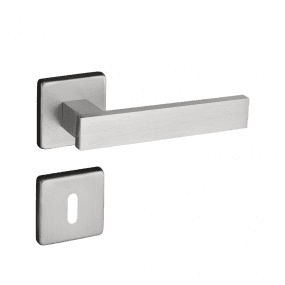 * Guarnição: 4 rosetas em aço inoxidável no acabamento Níquel Acetinado, fixadas por pressão em almas plásticas fixadas na porta por