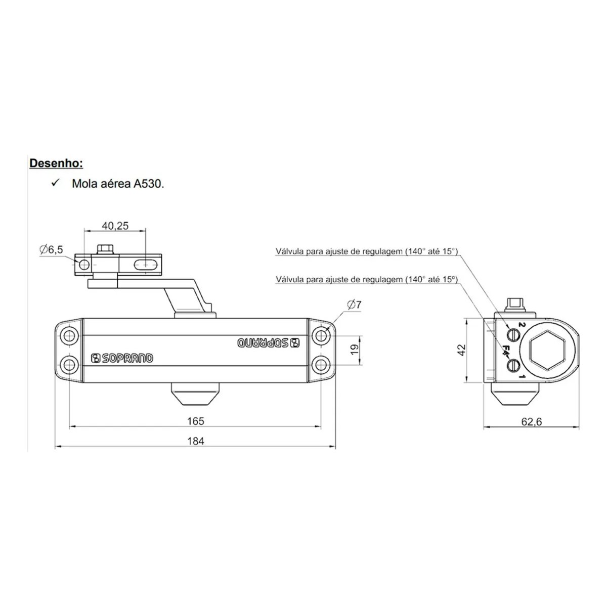 - Braço reforçado e com dupla regulagem por rosca que permite o ajuste da mola aérea sem a necessidade de remover o produto do local de instalação (diferencial Soprano).