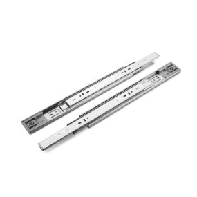 Descrição: Corrediça simples com abertura 3/4 do comprimento nominal e deslizamento suave com roldanas de poliacetal autolubrificadas. Duplo travamento aberto e sistema de fechamento automático Self-Closing e perfil Captive para compensar folgas laterais e estabilidade da gaveta. Material: Aço laminado. Acabamento: Pintura eletrostática epóxi branco. Capacidade: 15 kg por par