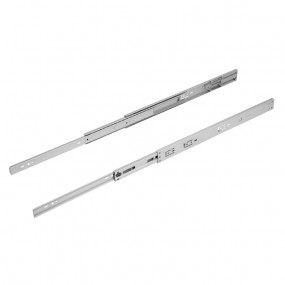 Descrição: Corrediça telescópica de abertura tota - deslizamento através de esferas de aço. Peça única de montagem esquerda e direita, com autotravante no final do curso aberto e travas no final do curso que permitem a retirada da gaveta. Material: Aço relaminado. Acabamento: Zinco eletrolítico cromatizado. Fixação: Lateral, sistema 32 mm com parafusos cabeça panela PHS AA 3,5. Capacidade: 25 kg por par