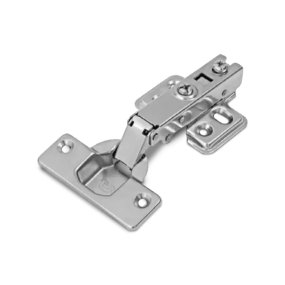 Dobradiça com sistema de amortecedor incorporado para fechamento suave das portas. Sistema de montagem com calço fixo que permite regulagem e possibilidade de dupla fixação.