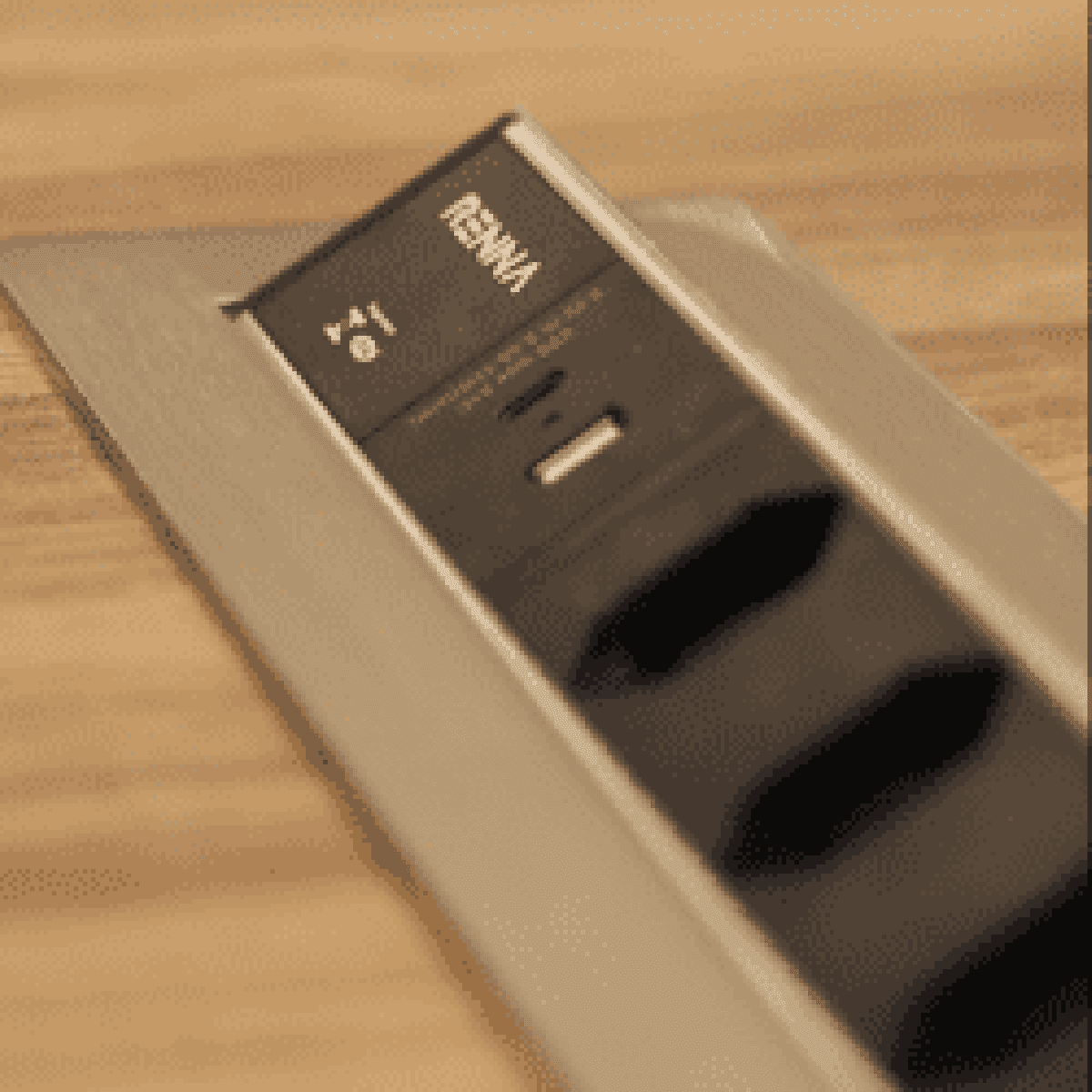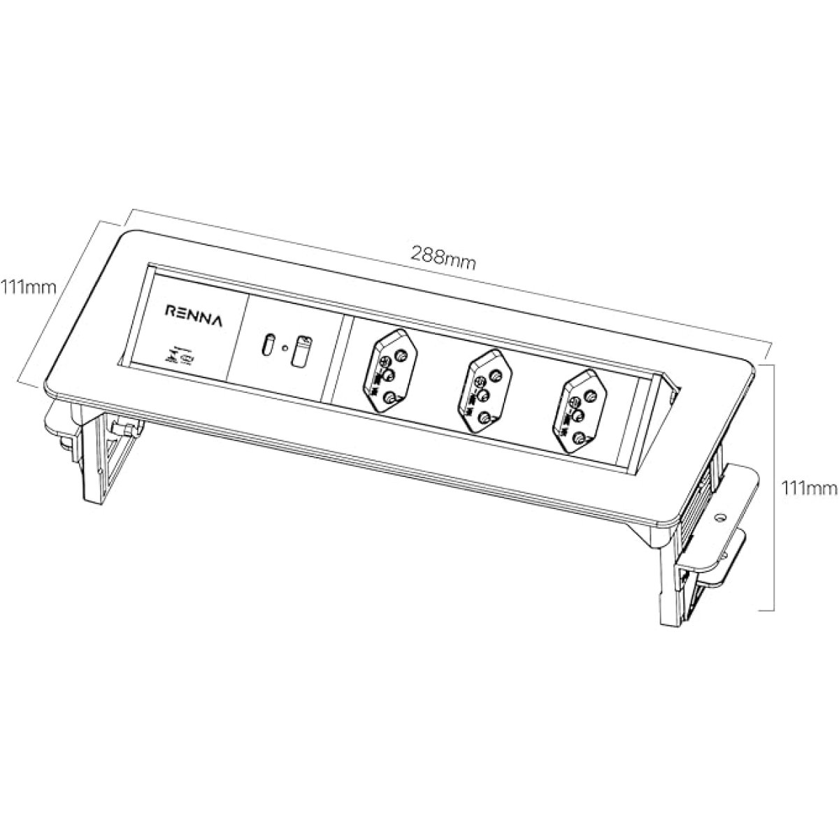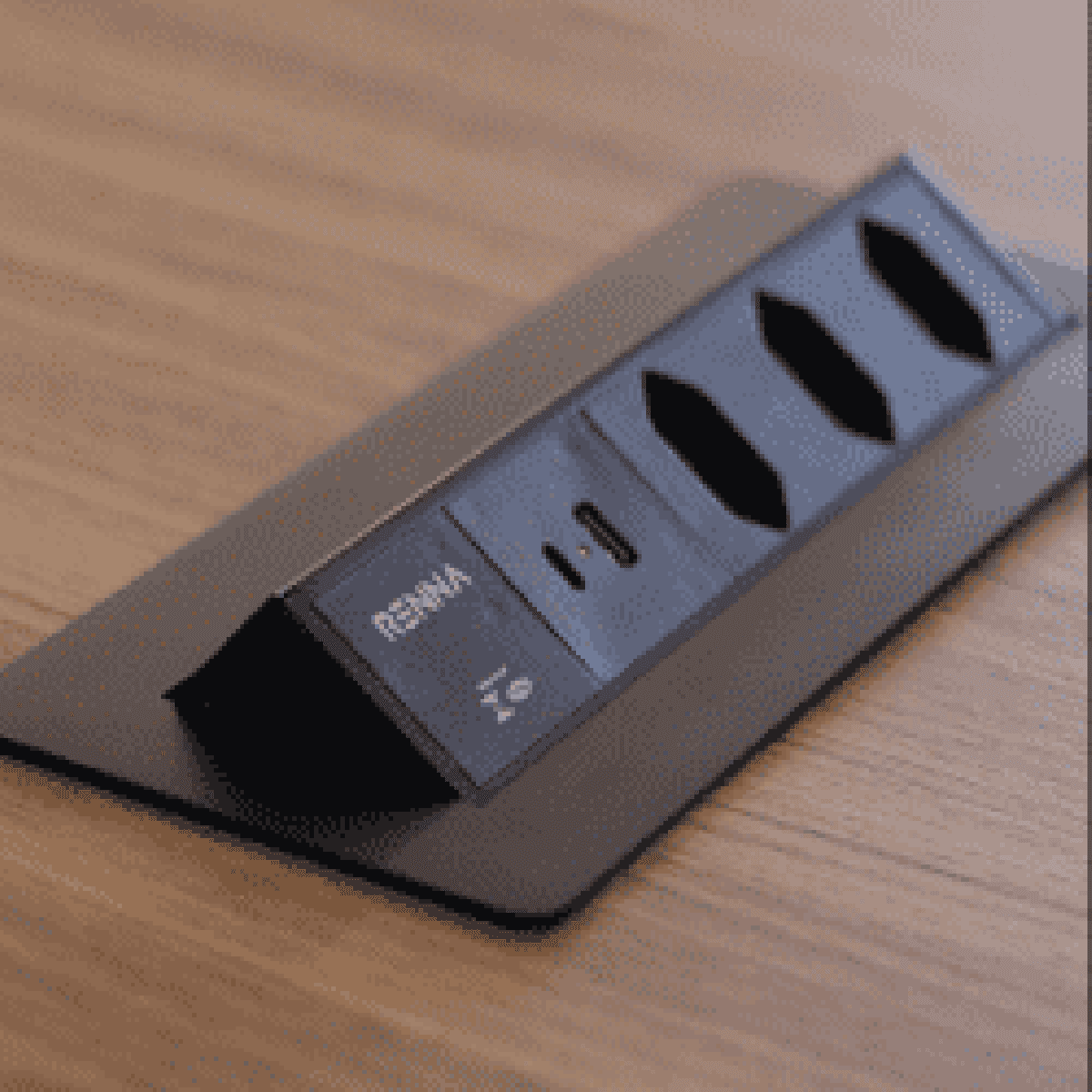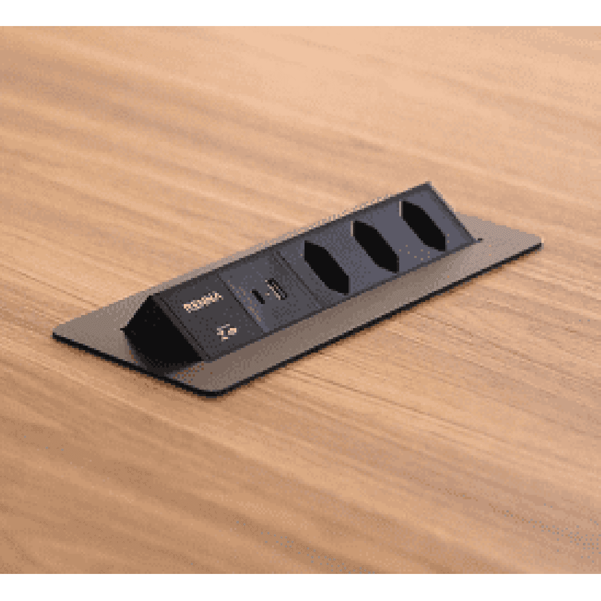 A caixa de tomadas com 3 tomadas e 2 portas USB é uma solução elegante e funcional para mesas de reunião. Fabricada em aluminio anodizado e plástico anti chama.