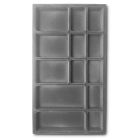 Material reforçado, atóxico, compartimentos funcionais para pequenas peças em vários tamanhos e profundidades, de fácil limpeza e manutenção.